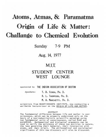 Thompson noted: “These all challenged scientific theories regarding life. I should stress that although these were challenging, we were never impolite.” He added that none of the founders of the Bhaktivedanta Institute “ever advocated being impolite to scientists.”