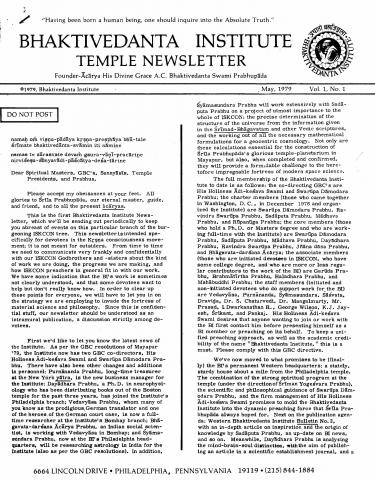(1979). Bhaktivedanta Institute Temple Newsletter No. 1, Vol. 1