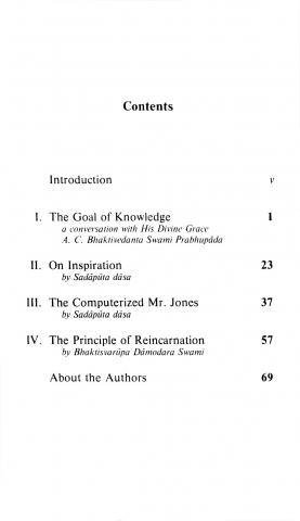 Chapter 1 "The Goal of Knowledge," features a lengthy conversation between Bhaktivedanta Swami and the University of California physicist Gregory Benford, originally published in "Perspectives on Bhaktivedanta Institute" (1979). Please click the UCI Faculty Profile button for more information on Benford's scientific background.