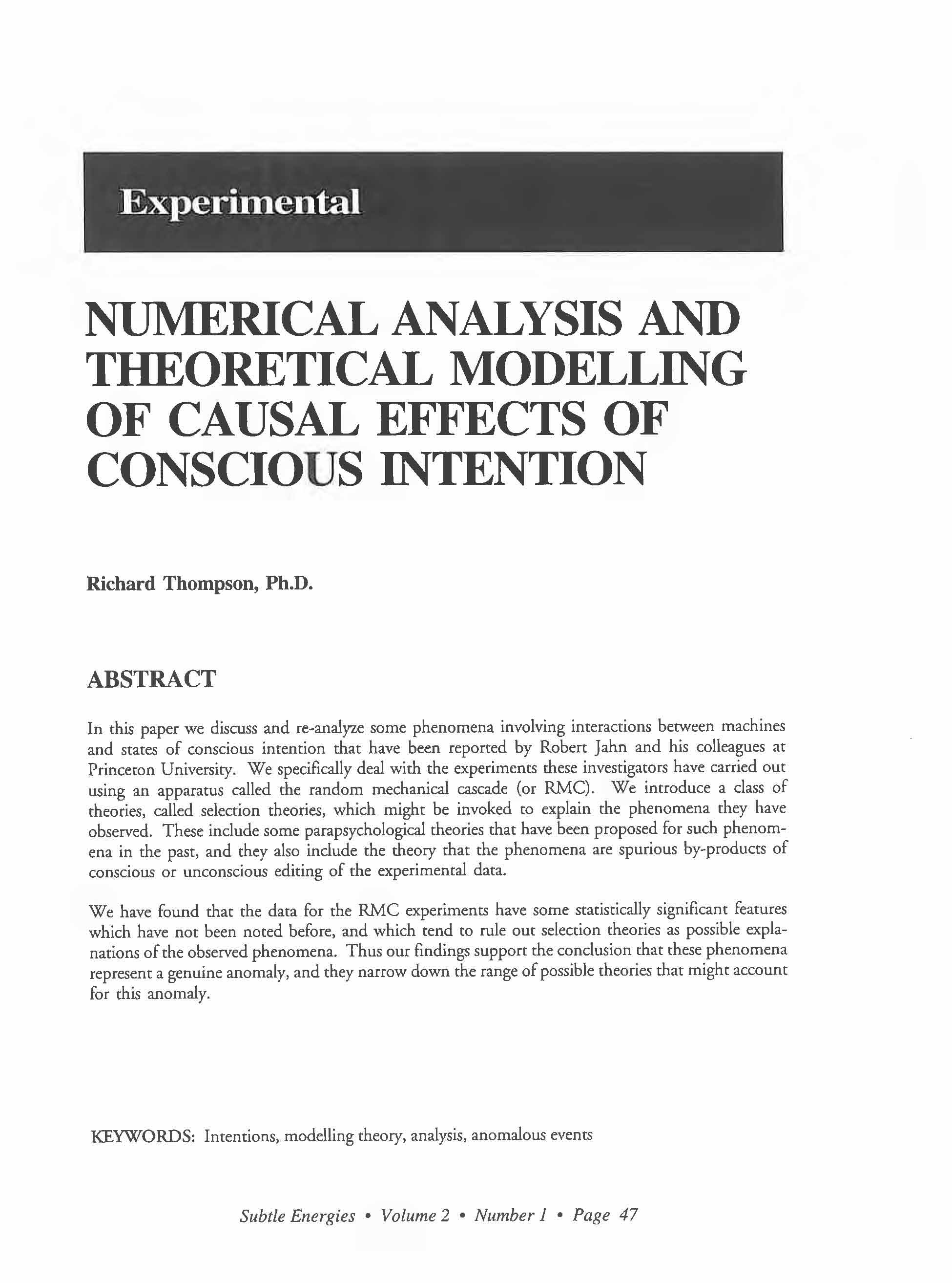 Thompson, Richard, "Numerical Analysis and Theoretical Modelling of Causal Effects of Conscious Intention," Subtle Energies and Energy Medicine Vol. 2, No. 1 (1991): 47-70.