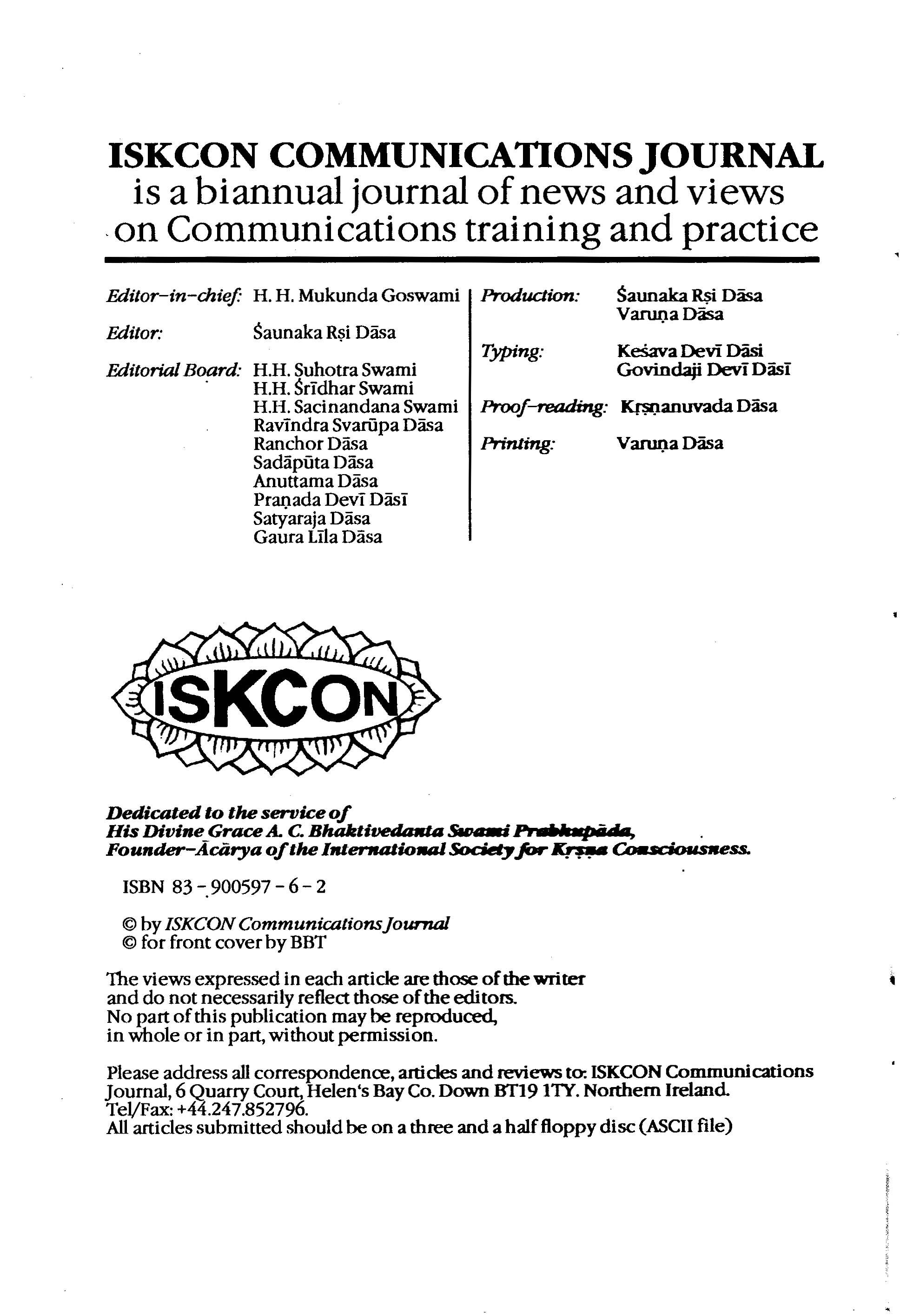 The essay was subsequently published in Back to Godhead Vol. 28 No. 1 (1994), with the title “Rational ‘Mythology.’” The BTG version was reprinted in 2004, in Thompson's God and Science (Alachua, FL: Govardhan Hill Publishing), pp. 37-58.