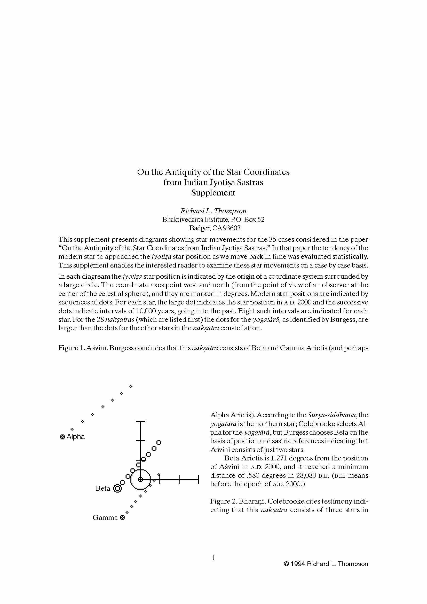 Thompson, Richard L. “On the Antiquity of Star Coordinates from Indian Jyotisa Sastras," 2nd ed., (Badger, CA: Bhaktivedanta Institute, 1994).
