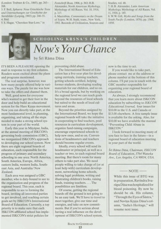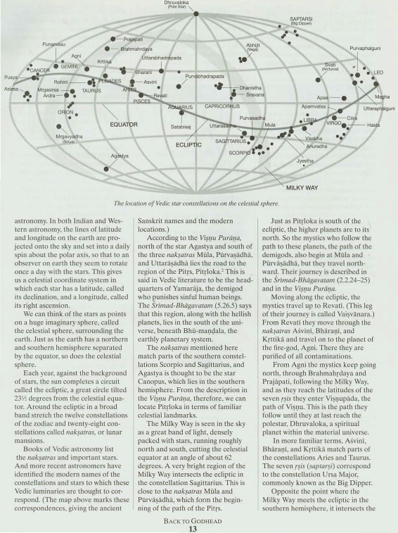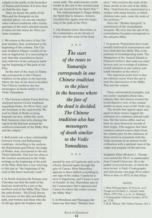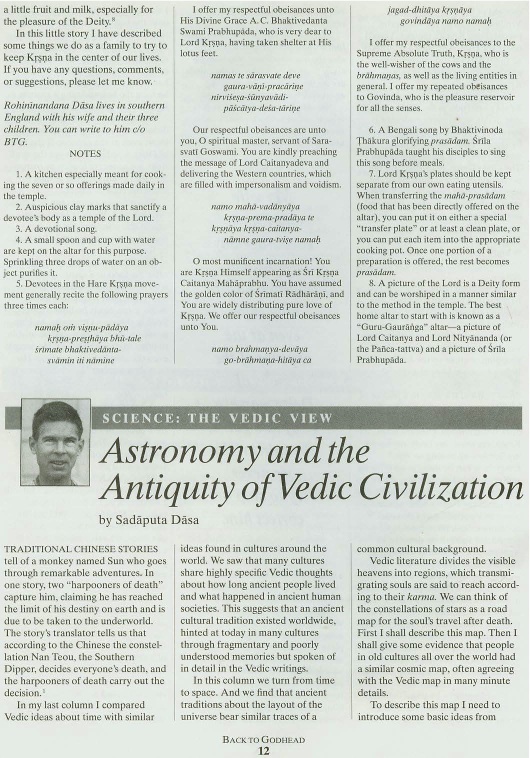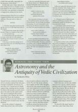 An examination of an extensive list of "astronomical examples" and "examples about time, indicate that old cultures around the world shared a view of the cosmos similar in many ways to the Vedic one. The details that appear again and again in these stories suggest the existence of a common cultural tradition. yet the stories differ, and we have no clear historical records of their origin. This suggests that their common cultural source dates from the remote past. So the existence of these stories is consistent with the Vedic accounts of an ancient world civilization with a spiritual view of the origin and purpose of the universe."