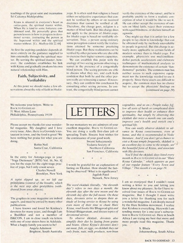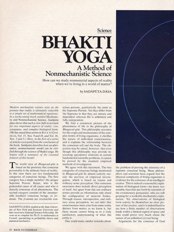 "Modern mechanistic science rests on the premise that reality is ultimately reducible to a set of mathematical equations. In a forthcoming book entitled Mechanistic and Nonmechanistic Science, Sadaputa dasa shows that such a view fails to account for two important aspects of reality: consciousness, and complex biological form. ... Here, in the first of a series of articles excerpted from the conclusion of the book, Sadaputa describes how an alternative, non mechanistic model can be verified t through the science of bhakti-yoga. He begins with a summary of the essential features of this model."