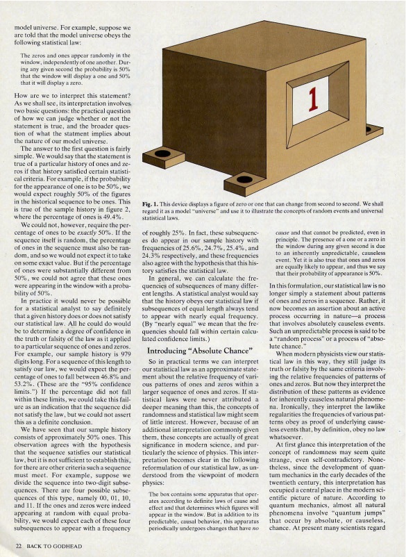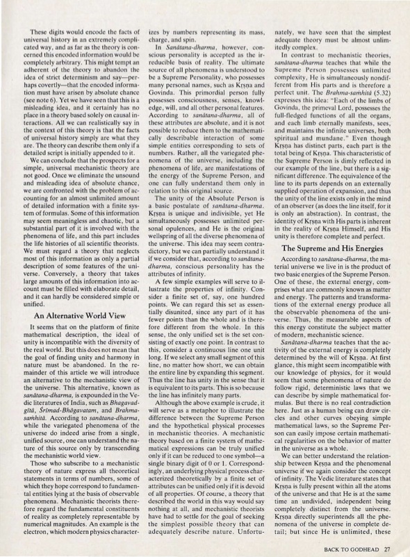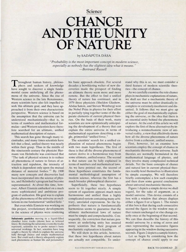 "Throughout human history, philosophers and seekers of knowledge have sought to discover a single fundamental cause underlying all the phenomena of the universe. Since the rise of Western science in the late Renaissance, many scientists have also felt impelled to seek this ultimate goal, and they have approached it from their own characteristic perspective. Western science is based on the assumption that the universe can be understood mechanically and mathematically ... and Western scientists have therefore searched for an ultimate, unified mathematical description of nature. ... The scientists' search for a unified explanation of natural phenomena begins with two main hypotheses. The first of these is that all the diverse phenomena of nature derive in a harmonious way from some ultimate, unified source. The second is that nature can be fully explained in terms of numbers and mathematical laws. ... [The] second of these hypotheses constitutes the fundamental methodological assumption of modern science, whereas the first has a much broader philosophical character. Superficially, these two hypotheses seem to fit together nicely. ... We will show in this article, however, that these two hypotheses about nature are actually not compatible. To understand why this is so, we must consider a third feature of modern scientific theory – the concept of chance. As we carefully examine the role chance plays in a mechanistic explanation of nature, we shall see that a mechanistic theory of the universe must be either drastically incomplete or extremely incoherent and disunited. It follows that we must give up either the goal of mechanistically explaining the universe, or the idea that there is an essential unity behind the phenomena of nature. At the end of this article we will explore the first of these alternatives by introducing a nonmechanistic view of universal reality, a view that effectively shows how all the diverse phenomena of nature derive from a coherent, unified source."