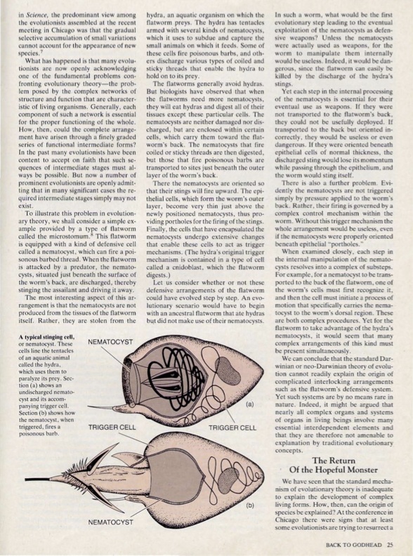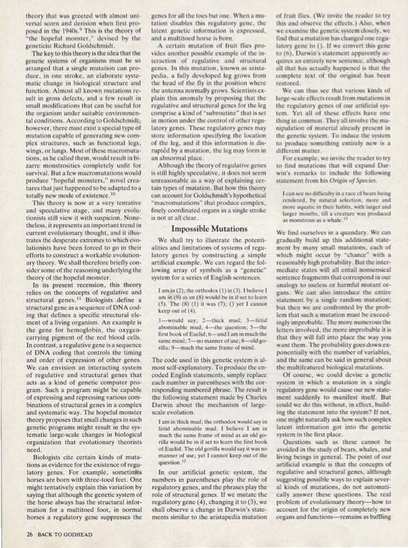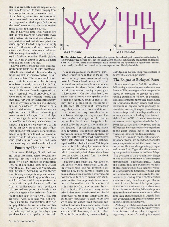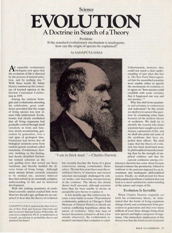 "'All reputable evolutionary biologists now agree that evolution of life is directed by the process of natural selection, and nothing else.' With these words Sir Julian Huxley summed up the consensus of learned opinion at the Darwin Centennial Celebration of 1959. ... With this striking unanimity of established scientific opinion reached little more than two decades ago, perhaps we are surprised to hear that the theory of evolution has become the focus of a great controversy among evolutionists themselves. ... A few months ago this controversy became a near battle as some 150 prominent evolutionists gathered at Chicago's Field Museum of Natural History to thrash out various conflicting hypotheses about the nature of evolution. ... Unfortunately, however, they could not reach a clear understanding ... The New York Times reported that the assembled scientists were unable either to specify the mechanism of evolution or agree on 'how anyone could establish with some certainty that it happened one way and not another.' ... Why this shift from unanimity to controversy and indecision? In this article we shall try to answer this question by examining some basic features of the modern theory of evolution. ... [Among them] we shall argue that the theory of evolution has been motivated more by philosophical misunderstanding than by the strength of empirical evidence and that the current confusion among evolutionary theorists has come about because factual evidence has persistently refused to conform to the patterns imposed by an inconsistent and inadequate philosophical system. Finally, we shall present for these philosophical problems a solution that can lead to a more satisfactory understanding of the nature and origin of life."