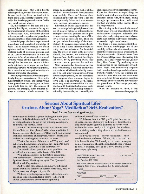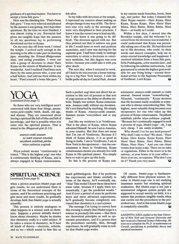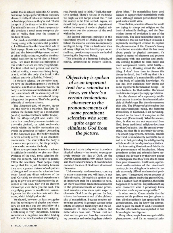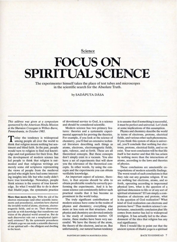 "In the past, people would turn to religion to find real knowledge and real guidance for their lives. But the developments of modern science have led people to think that religion is outmoded and that religious writings are merely some old scriptures representing the views of people from the medieval period who might have had some interesting insights into life but who really didn't have true knowledge. So what I'd like to do is show that bhakti-yoga, the systematic practice of devotional service to God, is a science and should be considered scientific."