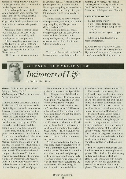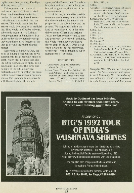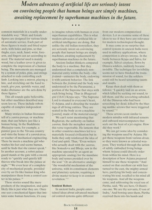 "In 1987 a young scientist named Chris Langton, from Los Alamos National Laboratory, put together in Santa Fe, New Mexico, the first conference on artificial life. The essence of life, he said, is organization transforming by rules, so we can study life effectively through computer simulation. ... Yet despite the humble start, artificial lifers seem confident that life will one day be embodied in silicon and freed from the constrains of carbon-based wetware. ... The idea that humans may be replaced by super intelligent machines is an old one. So instead of trying to analyze the prospects for artificial life, let me relate some stories from ... a treatise on machines in ancient India ... If this is true, it should be possible to create a technology of artificial life that directly takes advantage of the properties of the subtle body and the jivatma. ... Just as modern computers make cam-and-gearwheel devices old-fashioned, this Vedic technology ... would render gross physical technology – with its imagined super-human robots – obsolete."