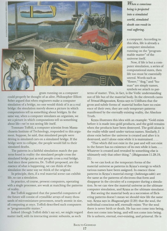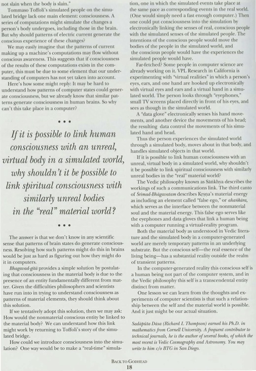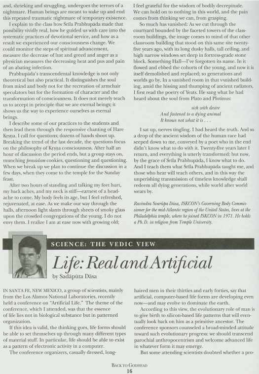 "The theme of the [Artificial Life] conference, which I attended, was that the essence of life lies not in biological substances but in patterned organization. If this idea is valid, the thinking goes, life forms should be able to set themselves up through many different types of material stuff. ... According to this idea, life is already a computer simulation running on the 'programmable matter' of the universe itself. ... This, in fact, is the Vedic understanding not of life but of the material body. In the eleventh canto of the Srimad Bhagavatam, Krishna says to Uddhava that the gross and subtle forms of material bodies have no existence of their own; they are only temporary patterns manifested by eternally existing reality, the Absolute Truth."