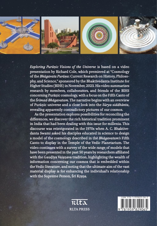 Exploring Purāṇic Visions of the Universe is based on a video presentation by Richard Cole, which premiered at “Cosmology of the Bhāgavata Purāṇa: Current Research on History, Philosophy, and Science,” sponsored by the Bhaktivedanta Institute for Higher Studies (BIHS) in November, 2023. His video summarizes research by members, collaborators, and friends of the BIHS concerning Purāṇic cosmology, with a focus on the Fifth Canto of the Śrīmad-Bhāgavatam. The narrative begins with an overview of Purāṇic universe and a close look into the Sūrya-siddhānta, revealing apparently contradictory pictures of our cosmos.