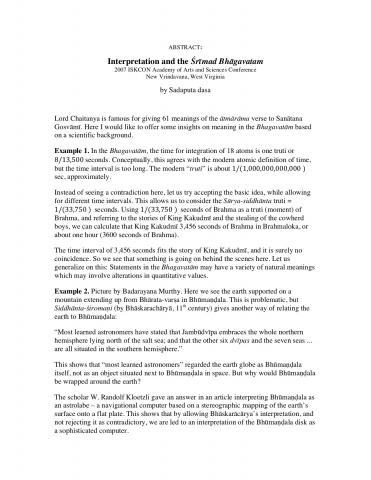 Sadaputa Dasa. "Interpretation and the Srimad Bhagavatam." Second Annual ISKCON Academy of Arts and Sciences (IAAS) Conference, New Vrindavana, WV, 15 December 2007.