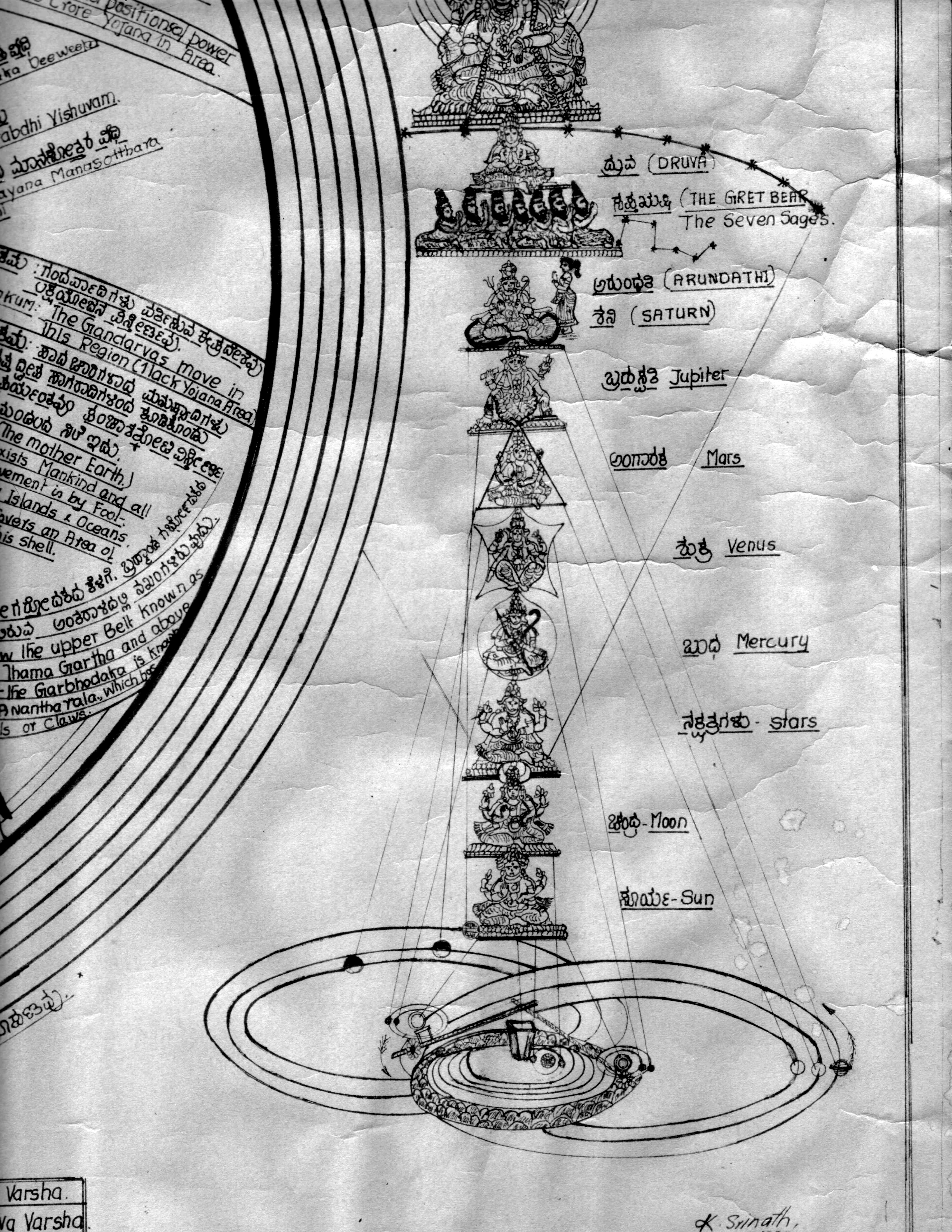 "On April 27th, 1976, Srila Prabhupada wrote a letter to Svarupa Damodara Das discussing the universe as described in the 5th Canto of the Srimad Bhagavatam. He asked his disciples with Ph.D’s to study the 5th Canto with the aim of making a model of the universe for a Vedic Planetarium. In this essay I will outline how such a model could be designed. This model has been called the 'chandelier model' since it hangs down from a point of suspension situated on the ceiling above it. Srila Prabhupada said, 'My final decision is that the universe is just like a tree, with root upwards. Just as a tree has branches and leaves so the universe is also composed of planets which are fixed up in the tree like the leaves, flowers, fruits, etc. of the tree. The pivot is the pole star, and the whole tree is rotating on this pivot. Mount Sumeru is the center, trunk, and is like a steep hill... The tree is turning and therefore, all the branches and leaves turn with the tree. The planets have their fixed orbits, but still they are turning with the turning of the great tree. There are pathways leading from one planet to another made of gold, copper, etc., and these are like the branches. Distances are also described in the 5th Canto just how far one planet is from another. We can see that at night, how the whole planetary system is turning around, the pole star being the pivot. Each planet has its orbit fixed but the sun is moving up and down, north and south.' From this we can imagine spheres representing planets connected to a central axis by pathways of gold, copper, etc. The axis is attached to the ceiling at its upper end. The entire arrangement will rotate about the central axis, and the planets will have their own orbits that also rotate as part of the upside-down tree. This is reminiscent of a mechanical solar system model known as an orrery. We can imagine this machine inverted and hung from the ceiling."