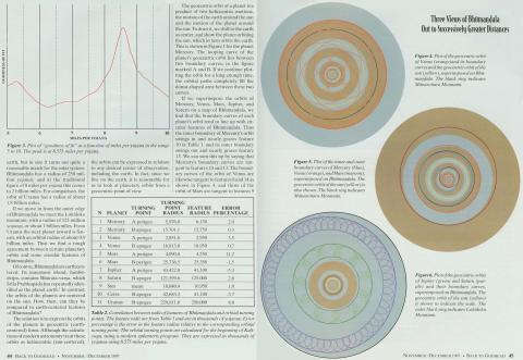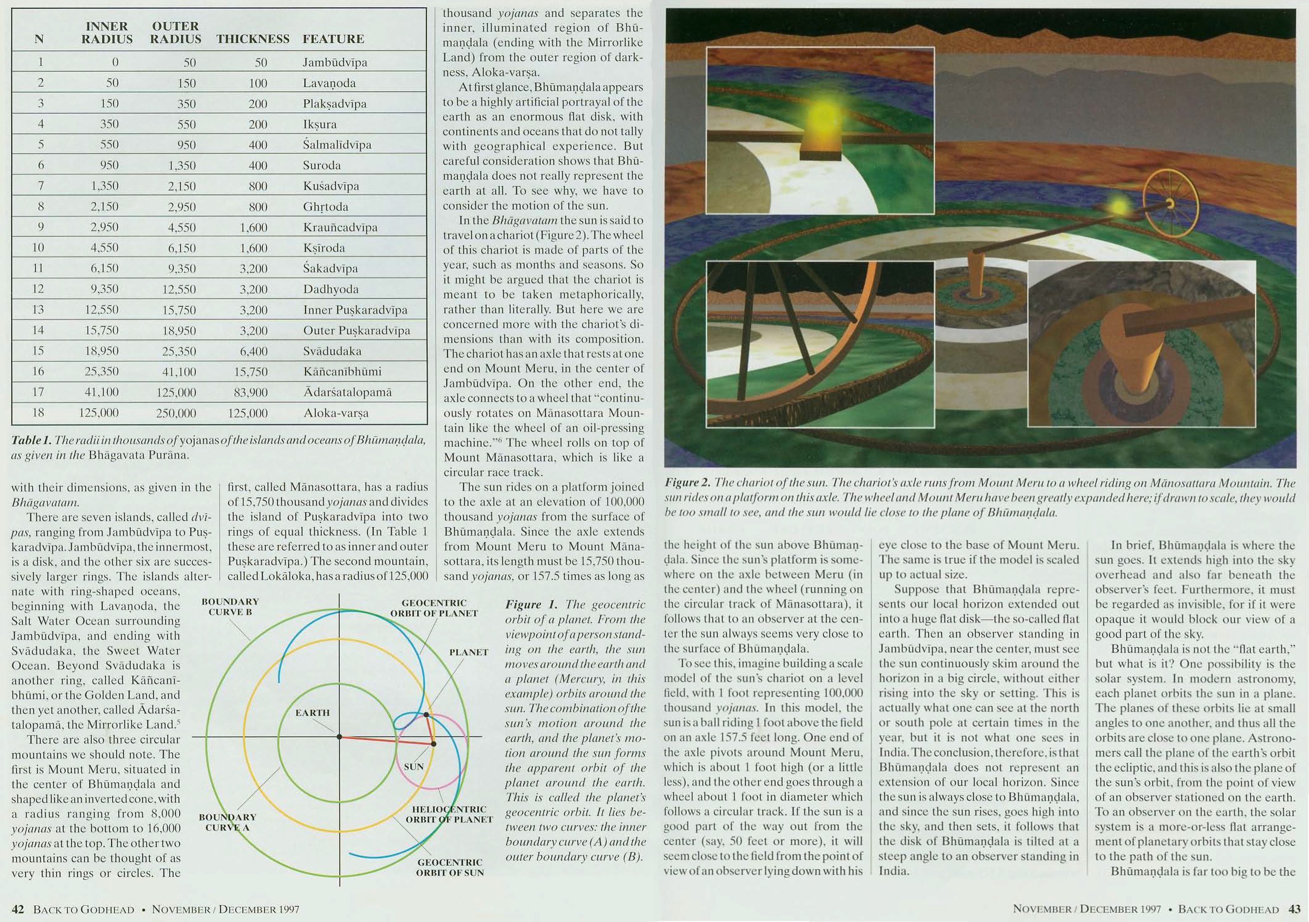 "In the Bhagavatam, Bhumandala—the 'earth mandala'—is a disk 500 million yojanas in diameter. The yojana is a unit of distance about 8 miles long, and so the diameter of Bhumandala is about 4 billion miles. Bhumandala is marked by circular features designated as islands and oceans. These features are listed on Table 1, along with their dimensions, as given in the Bhagavatam. . . At first glance, Bhumandala appears to be a highly artificial portrayal of the earth as an enormous flat disk, with continents and oceans that do not tally with geographical experience. But careful consideration shows that Bhumandala does not really represent the earth at all. To see why, we have to consider the motion of the sun. . . In brief, Bhumandala is where the sun goes. . . [If] Bhumandala is not the 'flat earth,' [then] what is it? One possibility is the solar system. . . To an observer on the earth, the solar system is a more-or-less flat arrangement of planetary orbits that stay close to the path of the sun. Bhumandala is far too big to be the earth, but in size it turns out quite a reasonable match for the solar system. . . Of course, Bhumandala is earth centered. . . In contrast, the orbits of the planets are centered on the sun. How, then, can they be compared to earth-centered features of Bhumandala? The solution is to express the orbits of the planets in geocentric (earth-centered) form. . . In fact, since we live on the earth, it is reasonable for us to look at planetary orbits from a geocentric point of view. . . In conclusion, the circular features of Bhumandala . . . correlates strikingly with the orbits of the planets from Mercury through Uranus (with the sun standing in for the earth because of the geocentric perspective). It would seem that Bhumanadala can be interpreted as a realistic map of the solar system, showing how the planets move relative to the earth. . . The small percentages of error . . . imply that the author of the Bhagavatam was able to take advantage of advanced astronomy. Since he made use of a unit of distance (the yojana) defined accurately in terms of the dimension of the earth, he must also have had access to advanced geographical knowledge. Such knowledge of astronomy and geography was not developed in recent times until the late eighteenth and early nineteenth century."