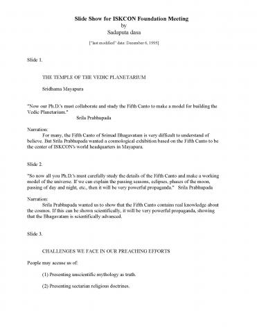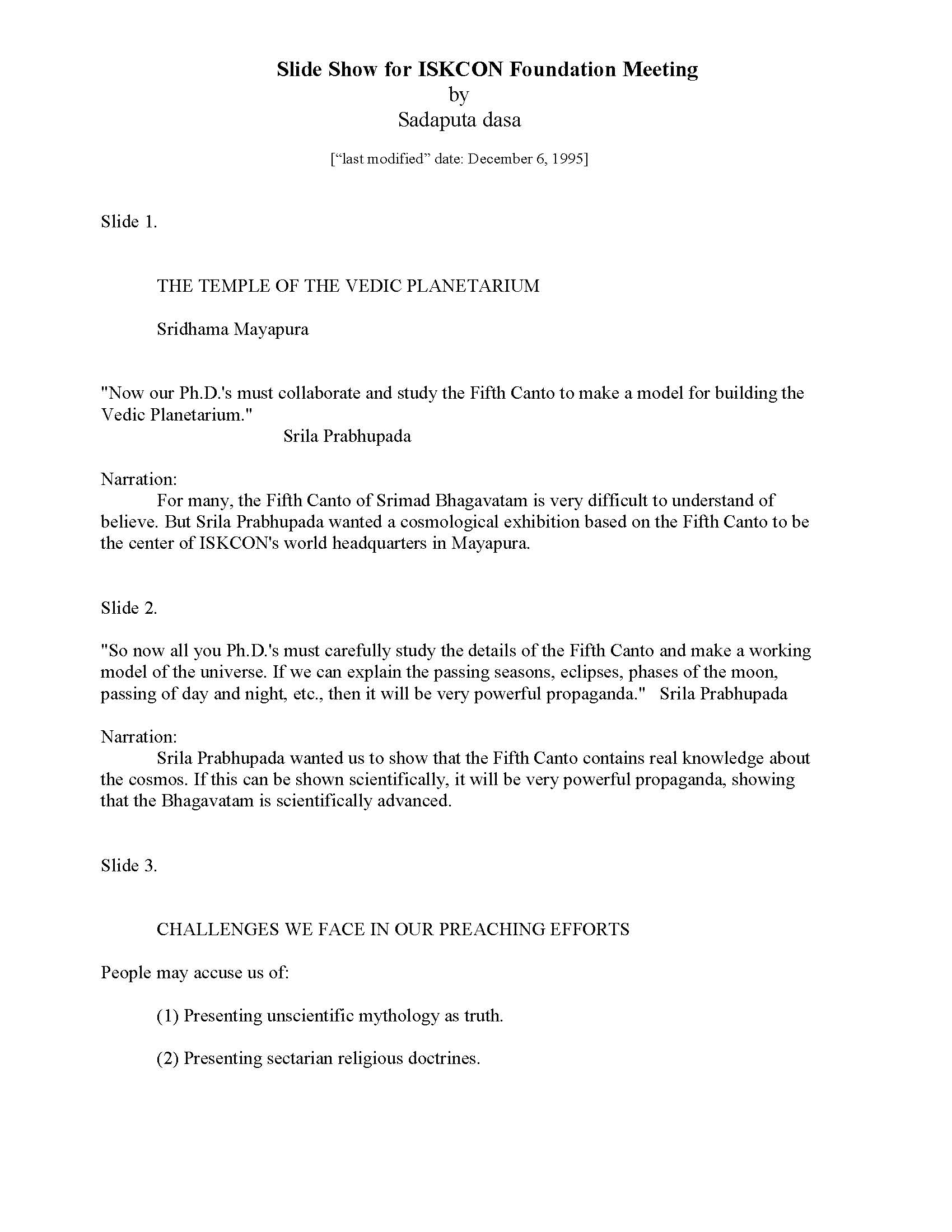 Slide show presented at the ISKCON Foundation, circa December 1995, illustrating exhibit proposals for the Temple of the Vedic Planetarium in Sridhama Mayapura. The textual descriptions for each of the thirty-seven exhibits contains both an explaination of the visual slide being presented, along with the accompanying narration.