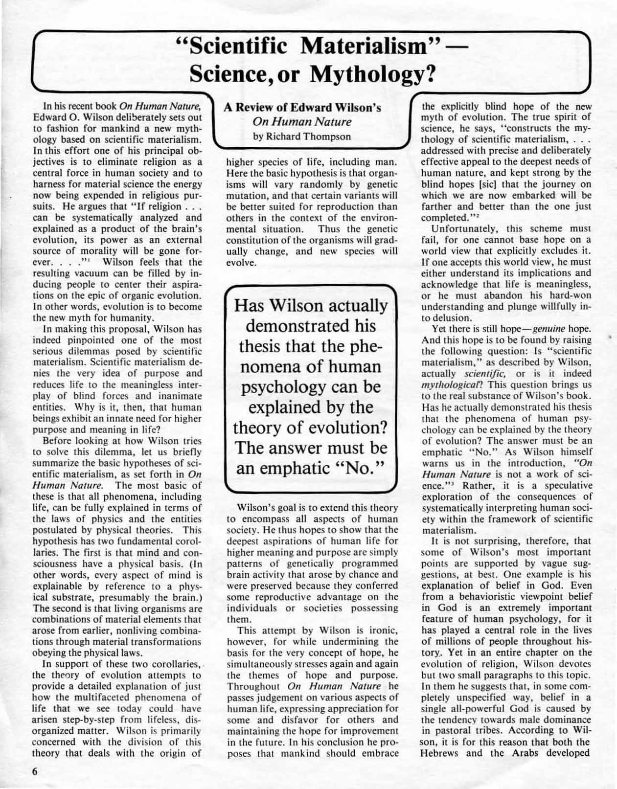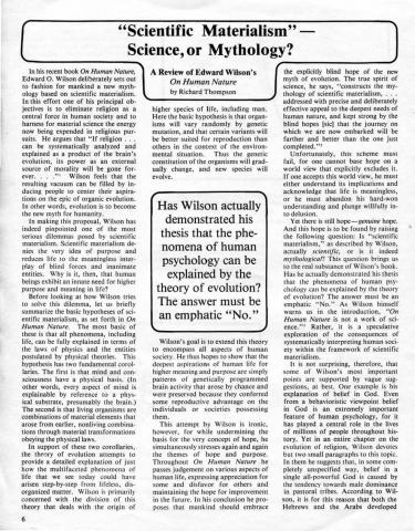 (1979). "'Scientific Materialism' – Science, or Mythology?' a review of On Human Nature by E. O. Wilson"