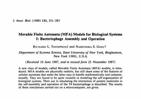 Goel, Narendra S., and Richard L. Thompson. "Movable finite automata (MFA) models for biological systems II: Protein biosynthesis." Journal of Theoretical Biology 134, no. 1 (1988): 9-49.