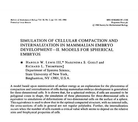 Lewis III, Harold W., Narendra S. Goel, and Richard L. Thompson. "Simulation of cellular compaction and internalization in mammalian embryo development—II. Models for spherical embryos." Bulletin of Mathematical Biology 50, no. 2 (1988): 121-142.