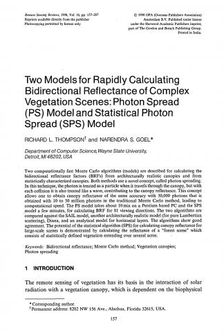 Thompson, Richard L., and Narendra S. Goel. "Two models for rapidly calculating bidirectional reflectance of complex vegetation scenes: Photon spread (PS) model and statistical photon spread (SPS) model." Remote Sensing Reviews 16, no. 3 (1998): 157-207.