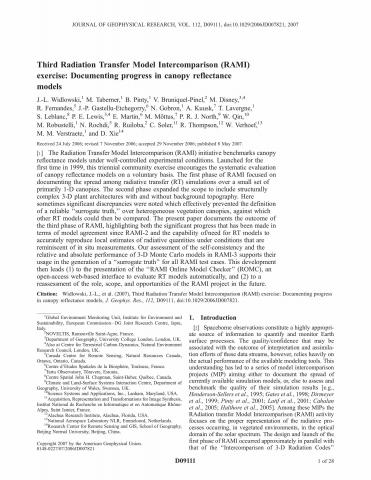 Widlowski, J.L, M. Taberner, B. Pinty, V. Bruniquel-Pinel, M. Disney, R. Fernandes, J.-P. Gastellu-Etchegorry, N. Gobron, A. Kuusk, T. Lavergne, S. Leblanc, P.E. Lewis, E. Martin, M. Mõttus, P.R.J. North, W. Qin, M. Robustelli, N. Rochdi, R. Ruiloba, C. Soler, R. Thompson, W. Verhoef, M.M. Verstraete, D. Xie, “Third Radiation Transfer Model Intercomparison (RAMI) exercise: Documenting progress in canopy reflectance models.” Journal of Geophysical Research: Atmospheres, Vol. 112, Issue 9 (May 16, 2007): pp D09111:1-28.
